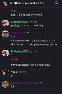 Team Ethereal, specifically Beetrolled and ShatteredWish14 was very sympathetic to Yuno, who they believed wouldn't steal netherite. As such, when Enderbean1322 decided to cryptically threaten Yuno, Ethereal members weren't pleased. Enderbean1322 was not able to get revenge for Cooldudecam11. Nyxie was also pissed at Enderbean1322, as she was YunoPastel's friend, so she threatened him, calling him a "pussy" for not doing it himself.