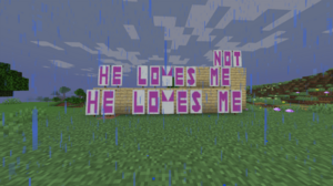 Beetrolled and Shattered's usage of the phrase became a minigame in season 6, where they were on the same team. The game was to find a way to uniquely get the other person to see the phrase "he loves me, he loves me not". The rules were that you had to set the thing up only when the other person is online. Both Beetrolled and ShatteredWish14 got very creative with it, not just writing it on signs. They used pieces of paper hidden in pots, block text screenshots, audio files, and other assorted ways. The number of times they each got each other was at a warp in the nether used for mining ancient debris.