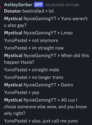 Hazie, or YunoPastel, is known for faking being trans and then announcing that he was detransitioning after getting rejected. He was apparently 34 years old and dating Nyxie.
